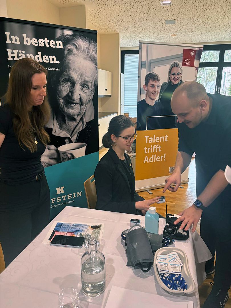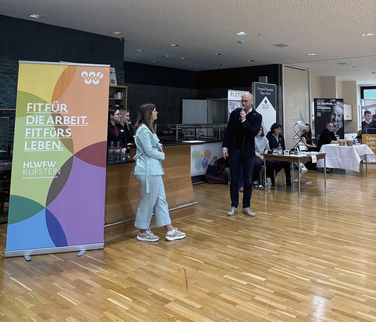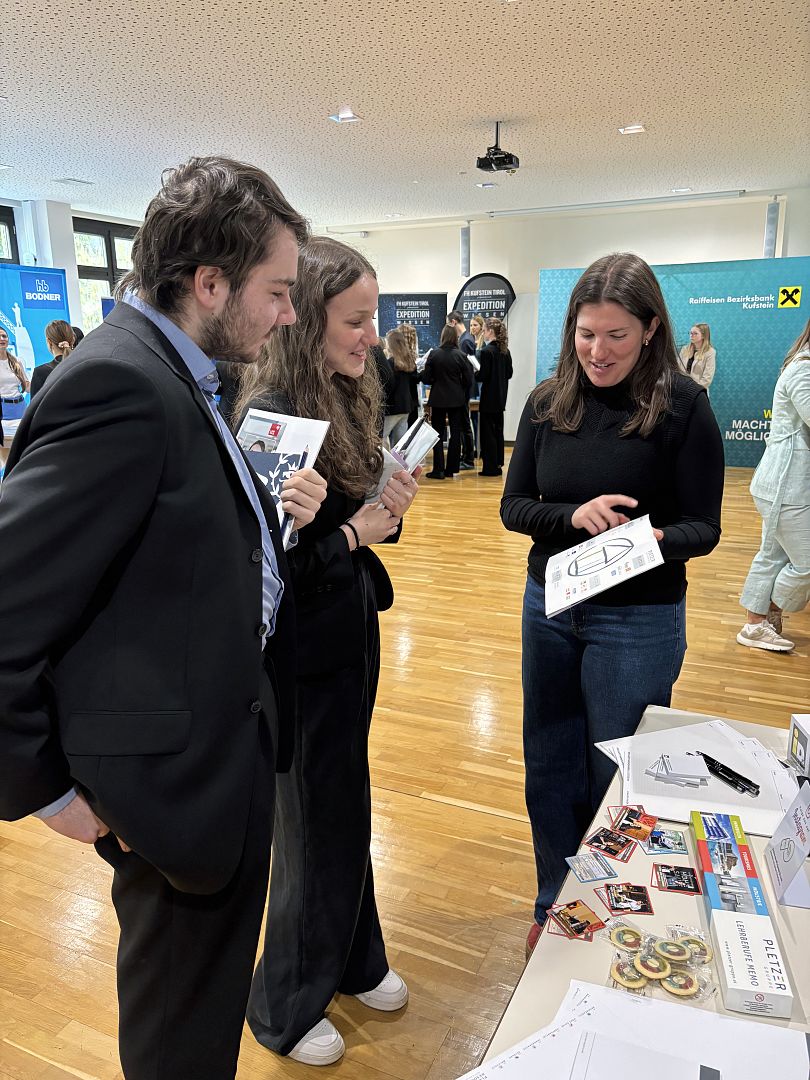 Am Mittwoch, den 25. Februar 2026, fand erstmals eine Berufs- und Praktikumsmesse in unserer Schule statt. Elf namhafte Unternehmen und Institutionen aus der Region präsentierten sich unsreen rund 250 teilnehmenden Schüler:innen als potenzielle Arbeitgeber. Mit dabei waren die Sparkasse Kufstein, die Raiffeisenbank Kufstein, LKW Walter, Tirolia Spedition, das Altersheim Kufstein, der Pflegecampus und das Krankenhaus Kufstein, die Pletzer-Gruppe, die Bodner-Gruppe, das Bundesministerium für Finanzen, das Land Tirol sowie die FH Kufstein.