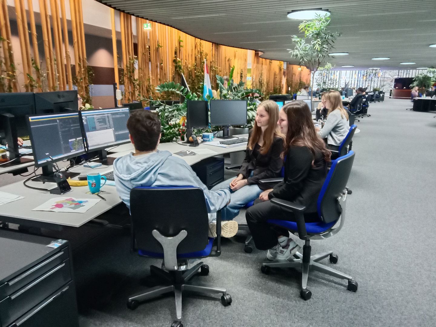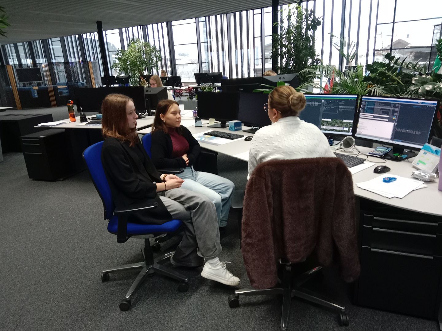 Danach erhielten die Schülerinnen und Schüler einen spannenden Einblick in den Arbeitsalltag des Unternehmens. In Zweiergruppen nahmen sie direkt an den Arbeitsplätzen der Mitarbeiterinnen und Mitarbeiter Platz, wo ausführliche Erklärungen zu den jeweiligen Aufgaben gegeben wurden – beispielsweise zur Prüfung, ob in einem LKW noch Platz vorhanden ist oder wie nach passenden Frächtern gesucht wird. Besonders spannend war, dass im Anschluss eigene praktische Tätigkeiten möglich waren: So konnten Kundinnen und Kunden telefonisch kontaktiert werden, um nach verfügbaren LKWs zu fragen, oder es erfolgten Gespräche mit Fahrerinnen und Fahrern über die verbleibende Lieferzeit.